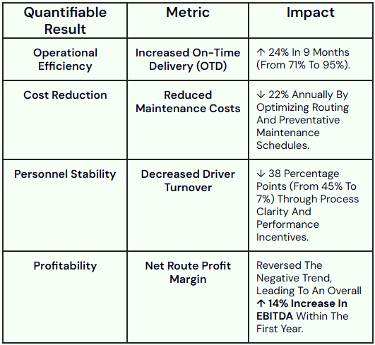 A regional trucking and freight brokerage firm was suffering from severe operational inefficiencies. High driver turnover (45%), excessive maintenance costs due to poor routing, and a lack of standardized safety/compliance procedures led to 18% negative profit margin on one-third of their high-volume routes.