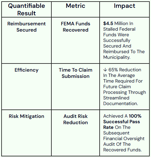 Following a major natural disaster, a municipal client was struggling to navigate the complex regulatory and documentation requirements of federal funding. Their inability to accurately track eligible expenses and submit compliant reports jeopardized $4.5 million in FEMA reimbursements, creating a severe liquidity crisis.