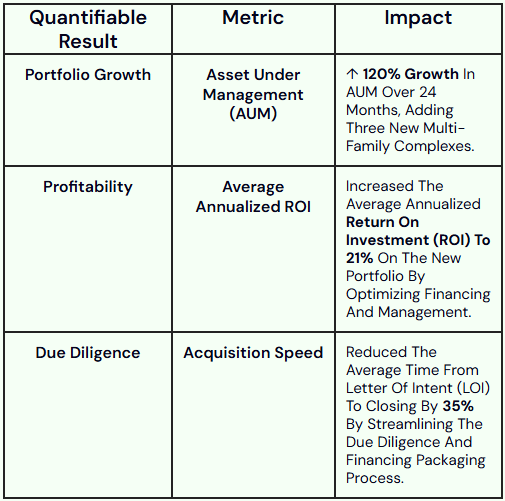A family-owned regional real estate investment firm needed to scale their multi-family acquisition portfolio but lacked the sophisticated financial modeling and due diligence capabilities required to secure institutional capital and effectively manage risk across multiple markets.